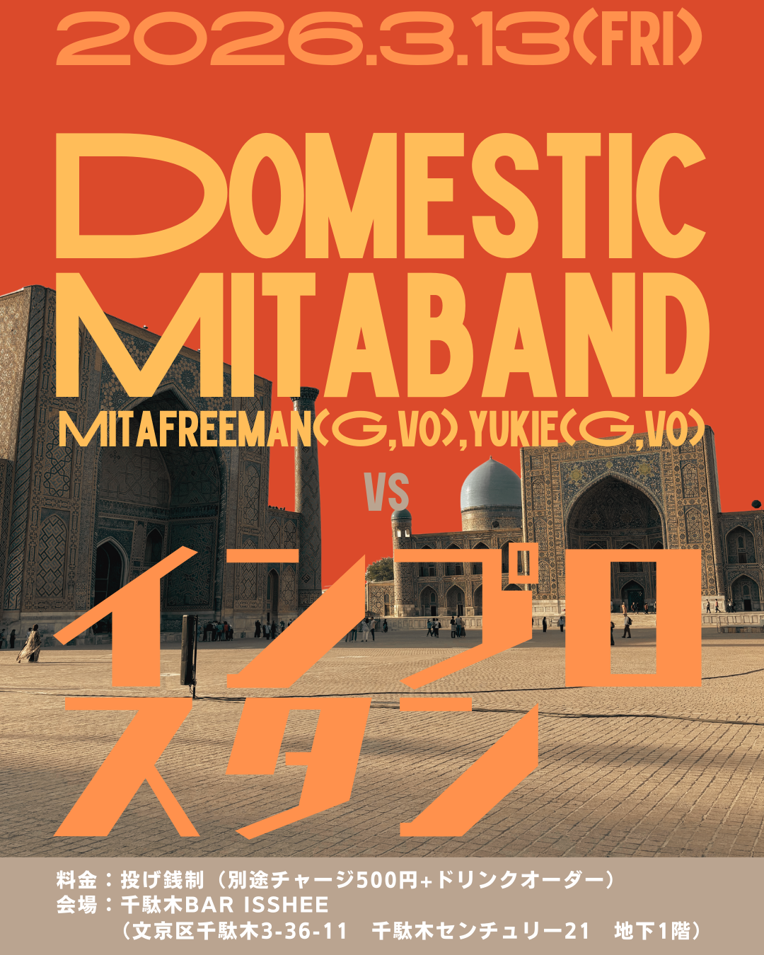 2026.3.13fri DomesticMitaBand vs インプロスタン 料金 投げ銭制 場所 千駄木Bar Isshee Domestic Mita band info DomesticMitabandが巻上公一古希記念ライブ「古希からはじまることもある」